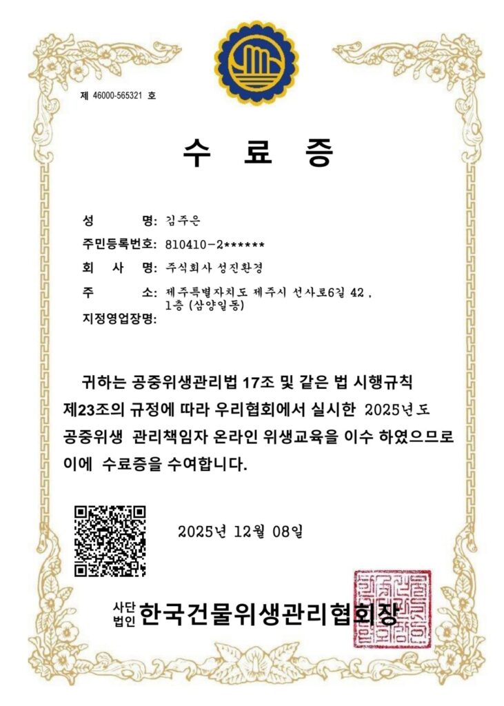 공중위생 관리책임자 수료증
